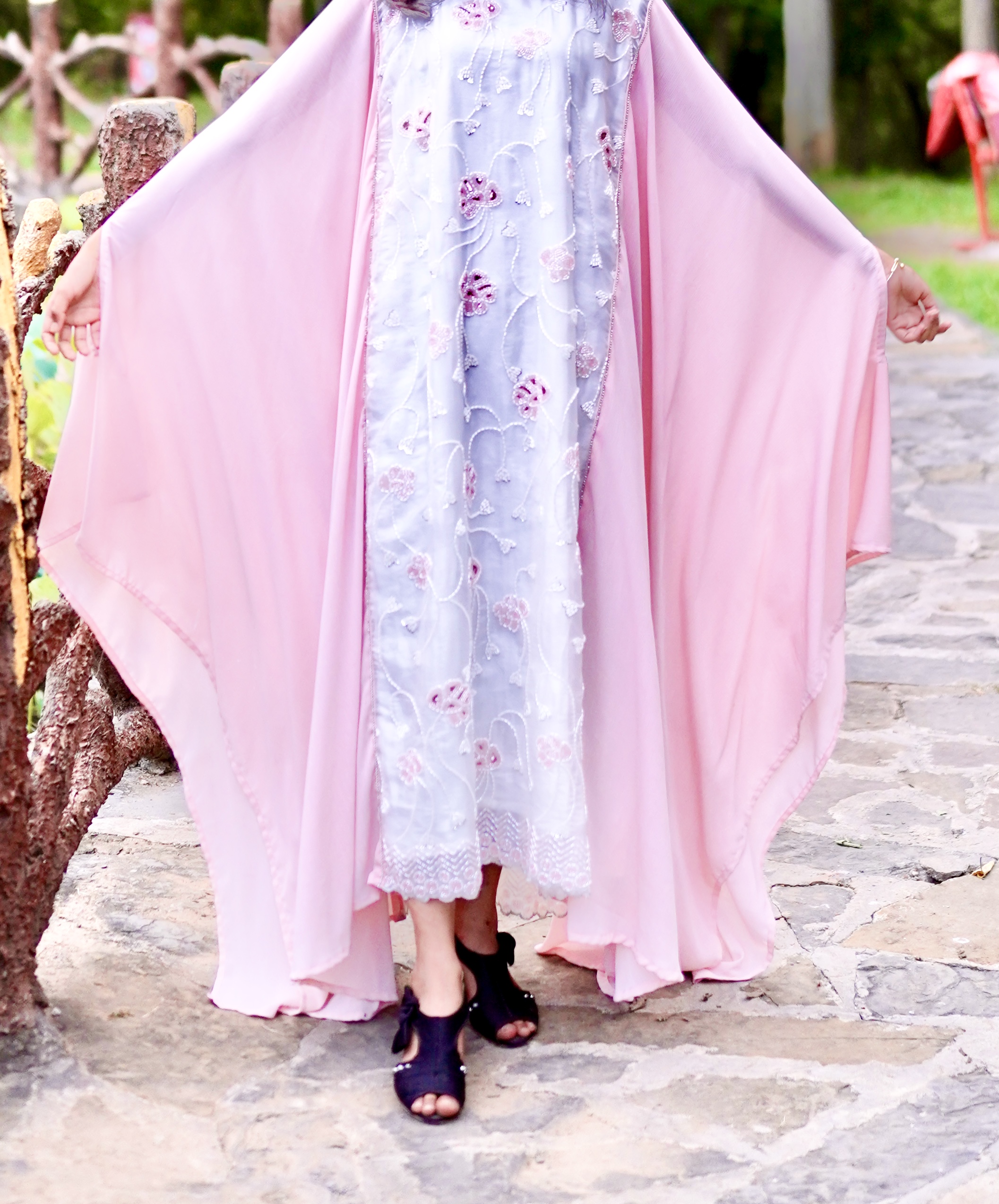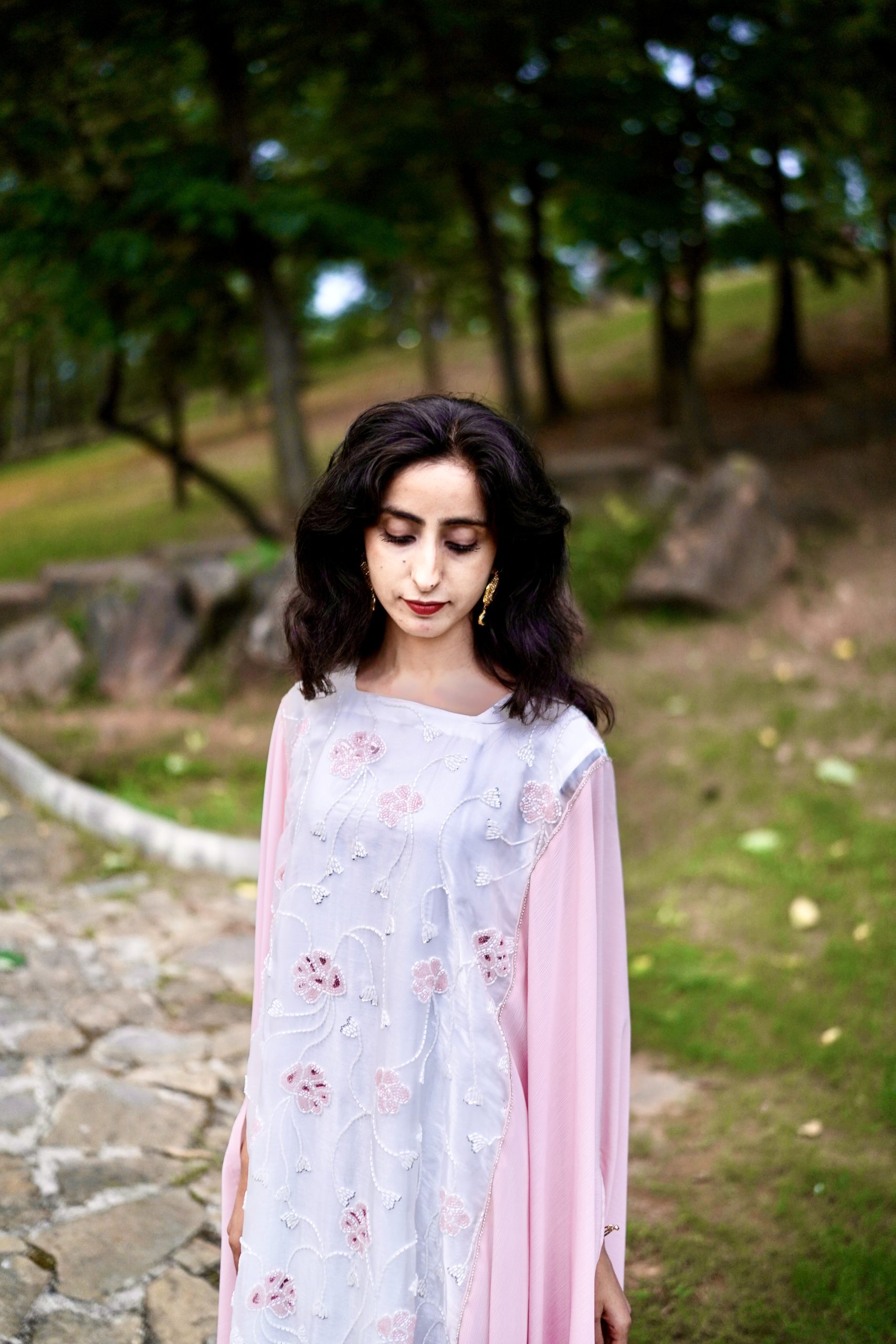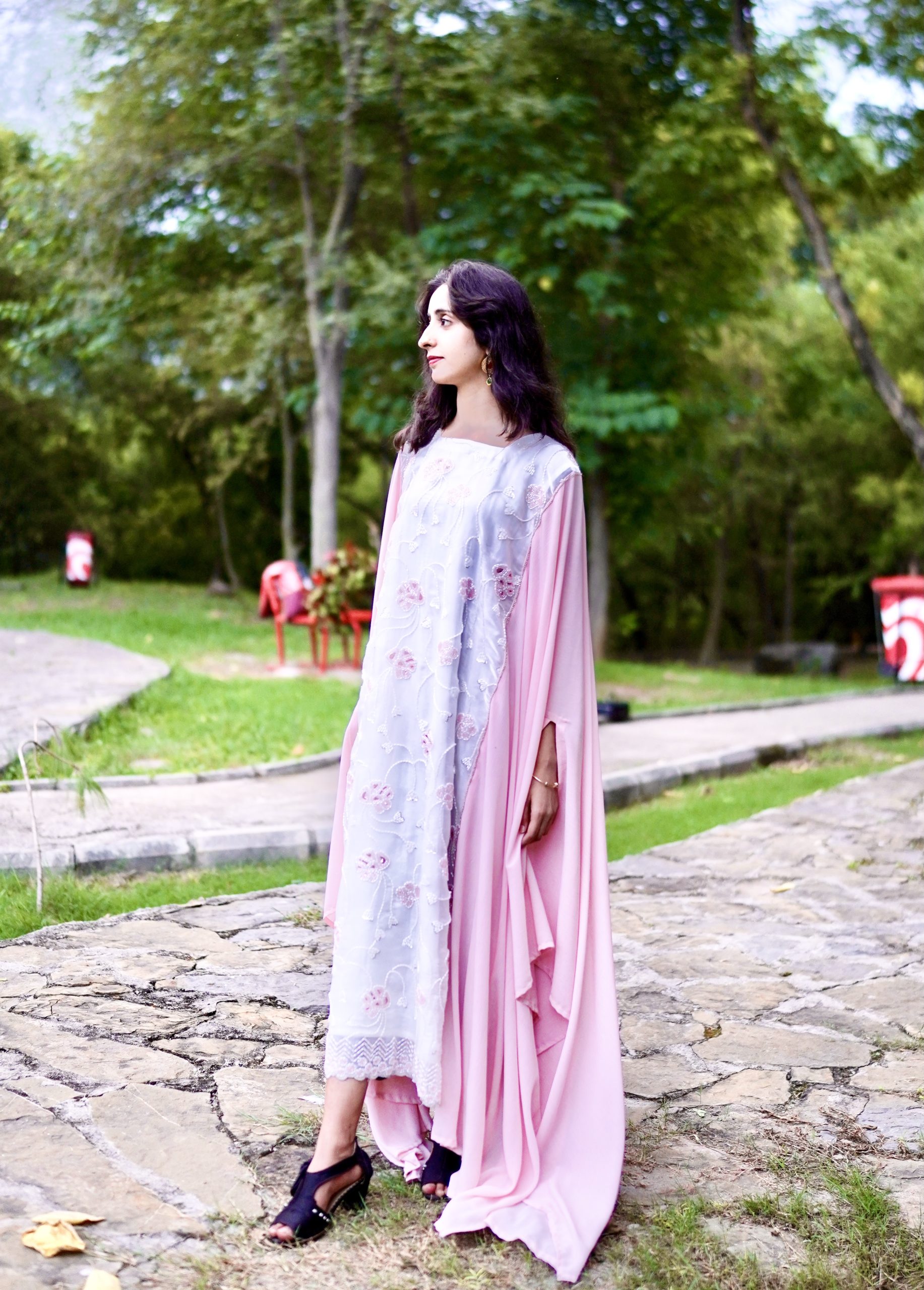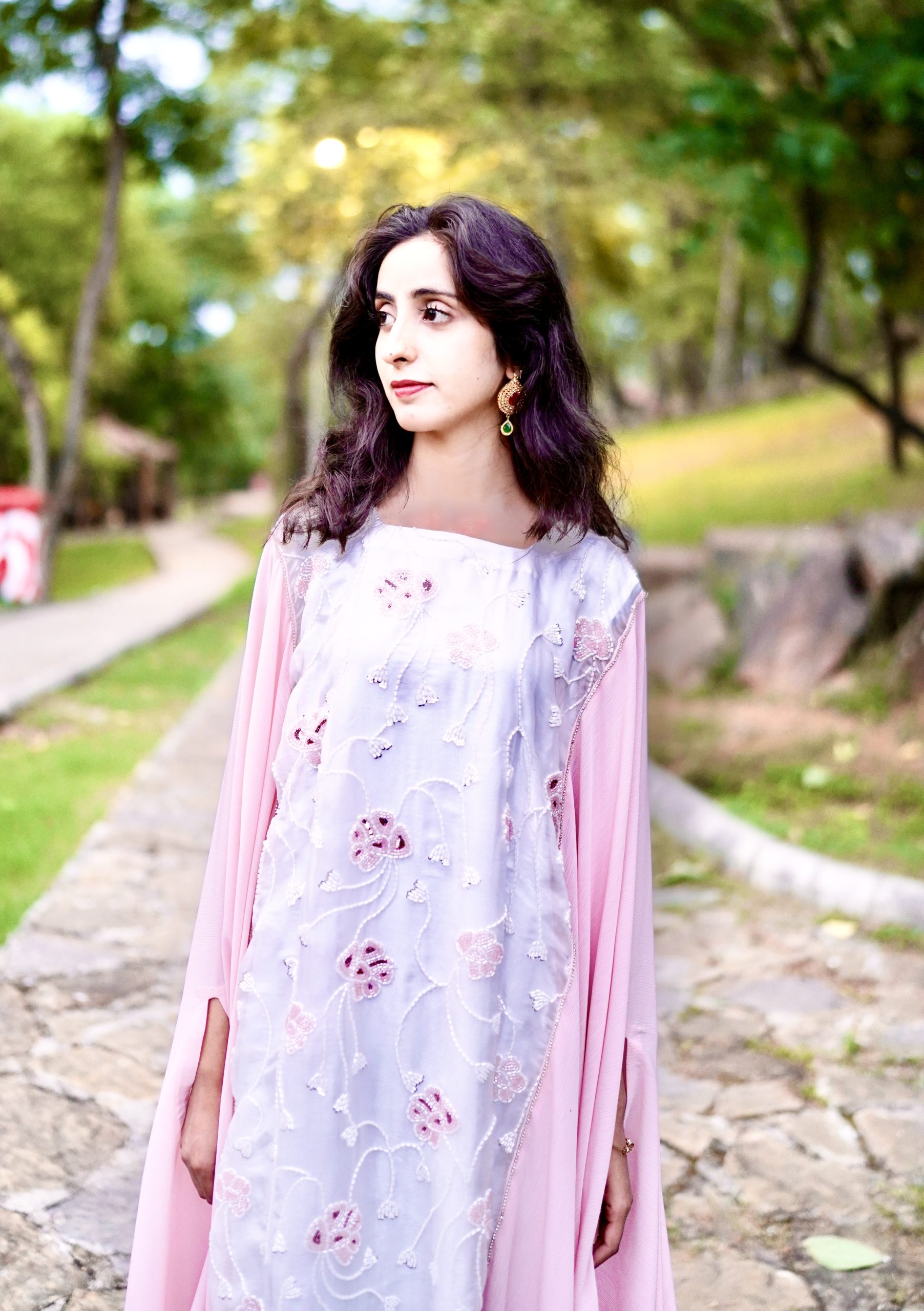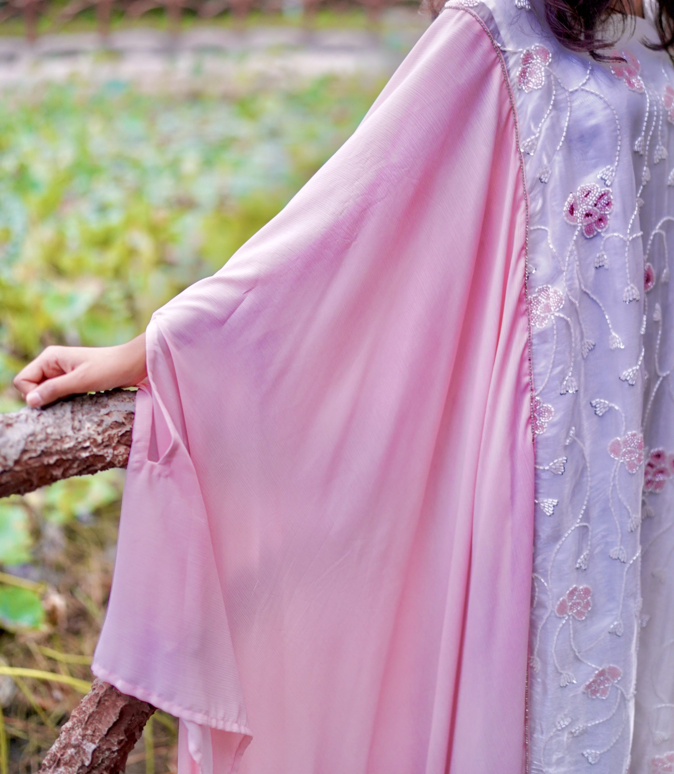 A chic fusion of elegance and style, this white and pink kaftan features a modern cut that adds a contemporary flair to your formal look. A perfect pick for effortless sophistication.